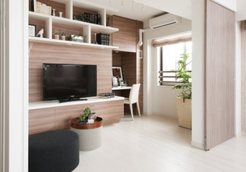 テレビなどの壁面収納の一区画をデスクに作り替えます。リビングなどの共用スペースを使用するので、お子様がいらっしゃる方にはそばで見守りながらお仕事できるので良いでしょう。
