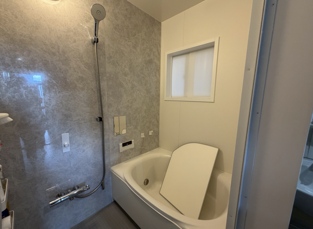 今回の施工はお風呂がメインのご依頼でした。施工を進める中で「どうせやるなら階段もやってしまおう」ということになり、ビリビリになっていた階段のクロスもあわせて張り替えさせていただきました。